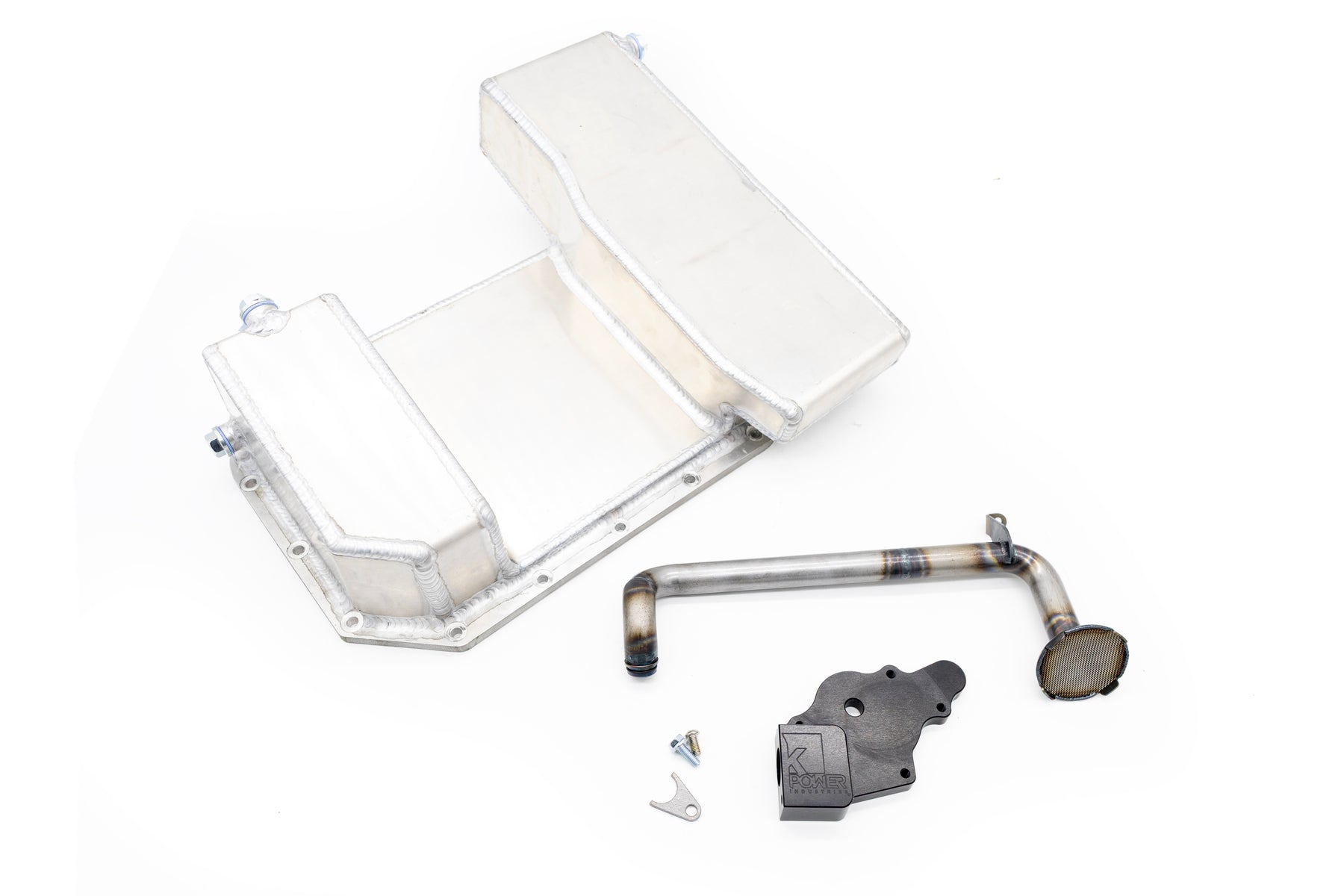 Our oil pan features our V2 oil pump housing with an O-ring bore seal, countersunk pickup hanger and screen to reduce oil starvation with dented oil pans, .100" thick oil pan walls, and a 3/8" oil pan rail.